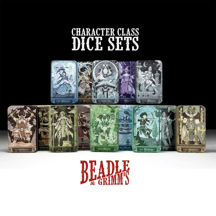 Beautifully designed tins of class-curated dice. Original tarot-style art representing each of the archetypical TTRPG classes (and the GM) in a collector’s edition tin. Each set of dice is carefully chosen to suit each class: extra D6’s for the Rogue’s Sneak Attack, extra D4’s for the Wizard’s Magic Missiles, and extra D12’s for the Barbarian’s massive Battle Axe!