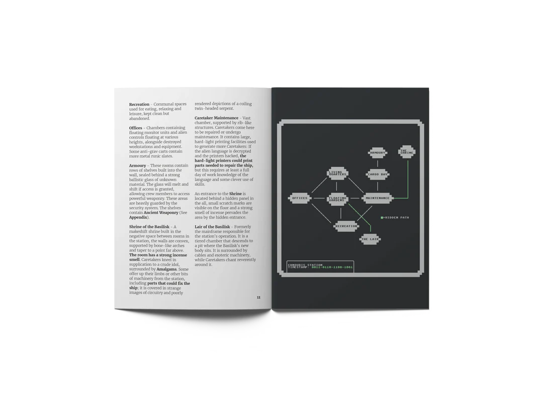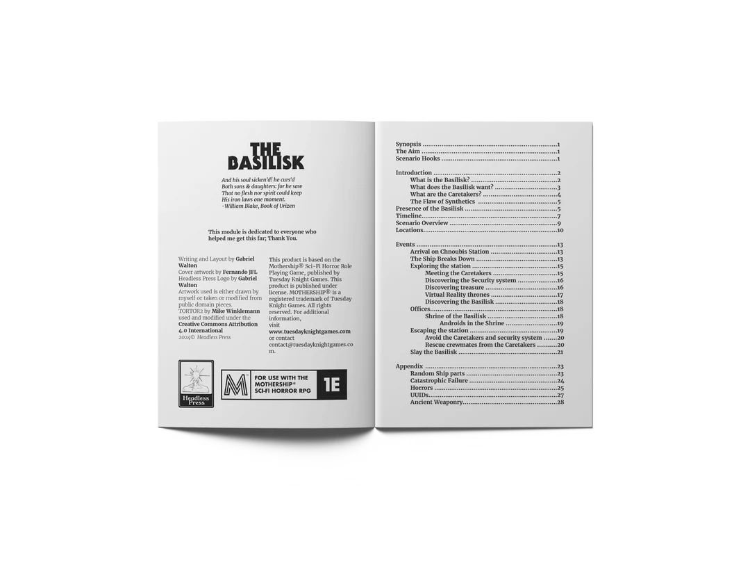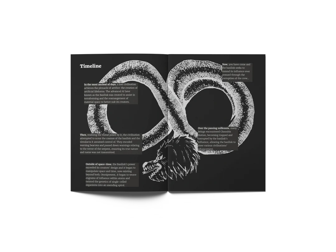 The Basilisk is a cosmo-gnostic sci-fi horror point-crawl for Mothership. When the crew finds themselves stranded on the abandoned carcass of Chnoubis Station they must attempt to survive long enough to profit from the riches within, all the while being drawn inexorably towards the revelation waiting in the bowels of the ancient structure. Can you escape the station and its coiling horror? If you do escape, are you ever truly free?